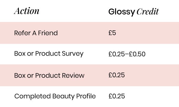 It’s easy. Write reviews for products in your GLOSSYBOX, complete monthly surveys, fill in your beauty profile and earn £5 in credit when you refer a friend to GLOSSYBOX. Sit back and watch the credits grow!